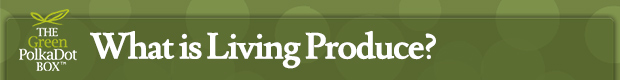 Living Produce is precisely what it sounds like: freshly harvested produce shipped roots and all in a bag of water. Receiving produce while it's still alive means it's better looking, better tasting, longer living and has superior nutrient value. On average, Living Produce will remain alive for 7-10 days before it begins to deteriorate and lose peak phytonuritient value -- the point at which you're typically buying your produce from the store.