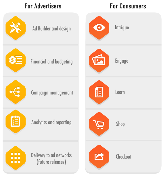 Our patented technology (Patent #10,121,163) offers an in-ad shopping experience that consumers are never forced to leave the page they are on. We offer three types of ads; Lead Generation, Surveys, and eCommerce with a secure direct communication with the advertiser’s shopping cart. Our platform allows for a typical ad design to morph into a smart ad by adding an engine with new intelligent features that are practical, useful, and responsive for consumers. These features offer new engagement tools that have not been available to ad agencies or designers until now.